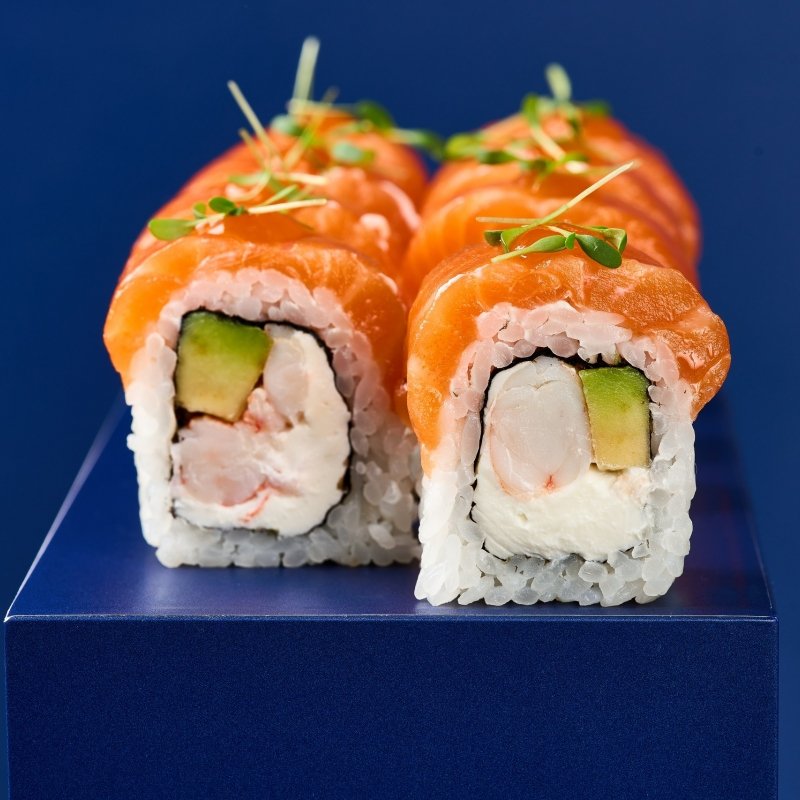 Премиум ролл с слабосолёным лососем, тигровыми креветками, творожным сыром, авокадо, соусом манго-чили и микрозеленью.