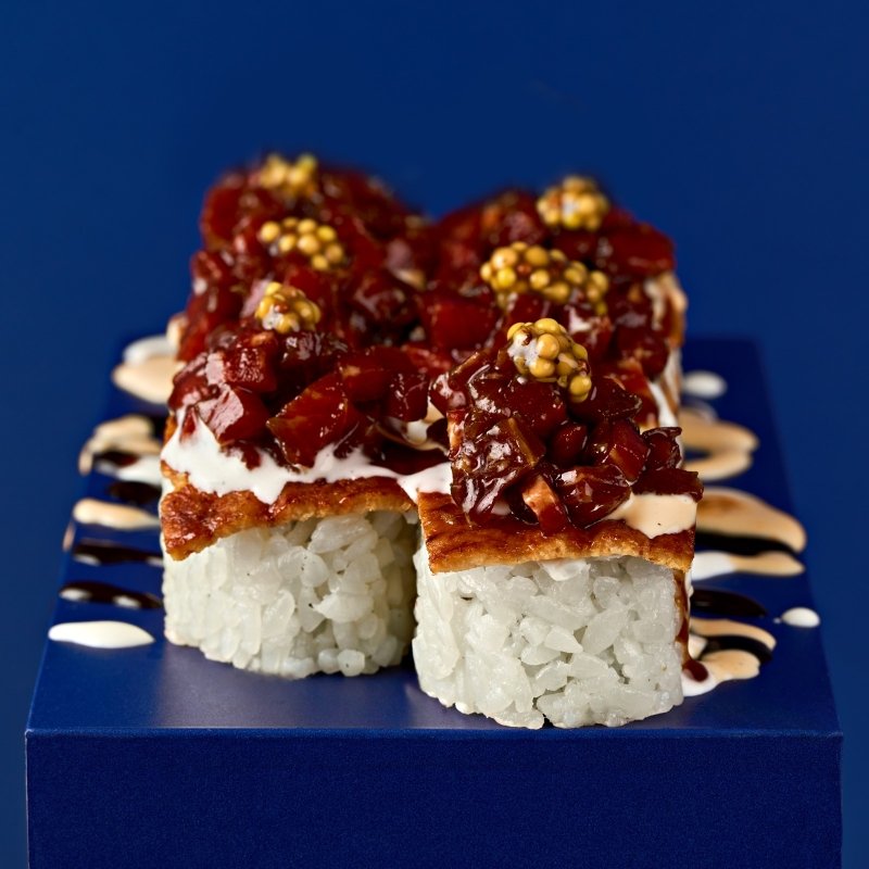 Ролл с креветками и тартаром из тунца. Внутри угорь, творожный сыр. Украшен красной и черной икрой масаго, соусом пармиджано, терияки и соевым соусом. Режется на 6 кусочков.