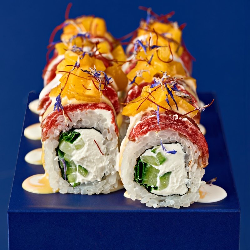 Ролл с говяжьей вырезкой и кусочками персика. Внутри творожный сыр, огурец, зелёный лук. Украшен нитями чили, цветами василька, соусом терияки, пармиджано, горчичный и гриль.