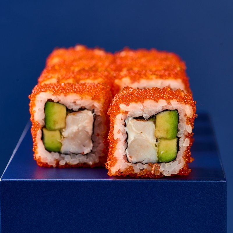 Все самое лучшее сразу: премиум ролл с тигровыми креветками, авокадо, майонез и икра тобико.