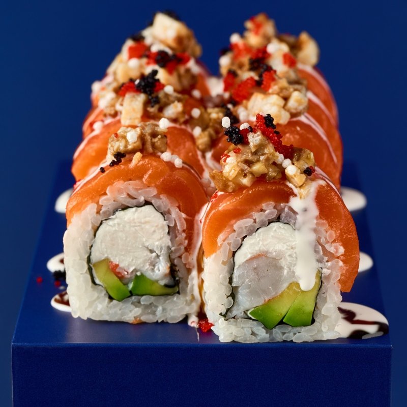 Ролл со слабосолёным лососем и тартаром из угря. Внутри творожный сыр, креветки, авокадо. Украшен рисовыми шариками, красной и чёрной икрой масаго. Полит соусом пармиджано и терияки.