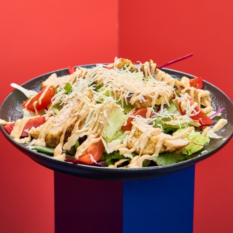 Салат Айсбер, лист салата, помидоры черри, куриное филе, соус Цезарь, Пармезан, сухарики.