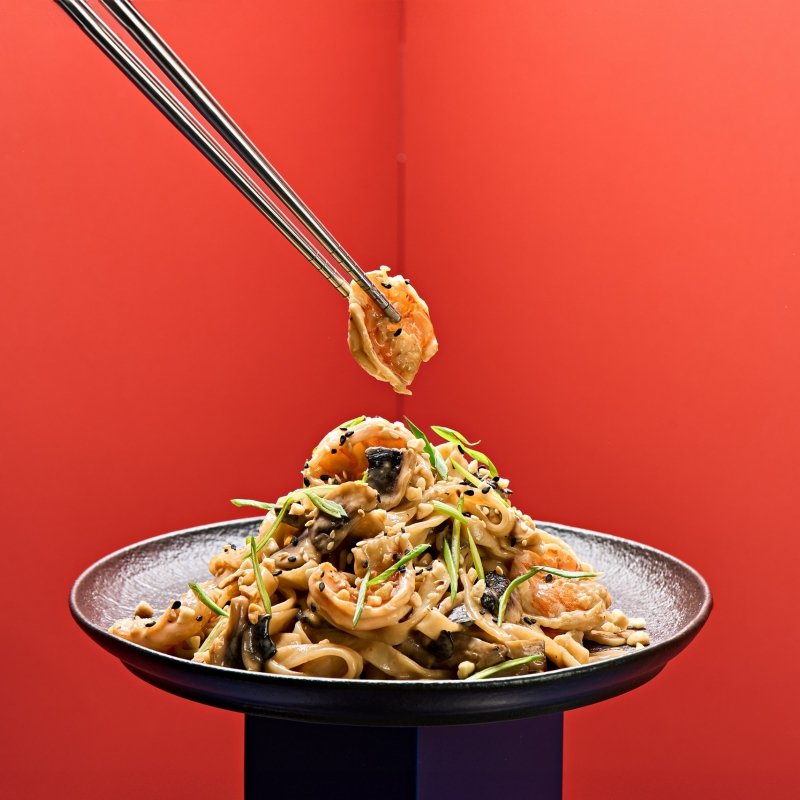Сырно-сливочный соус на кокосовом молоке, шампиньоны, арахис, зелёный лук и кунжут. На выбор: с курицей/креветкой. Подается с лапшой Удон.