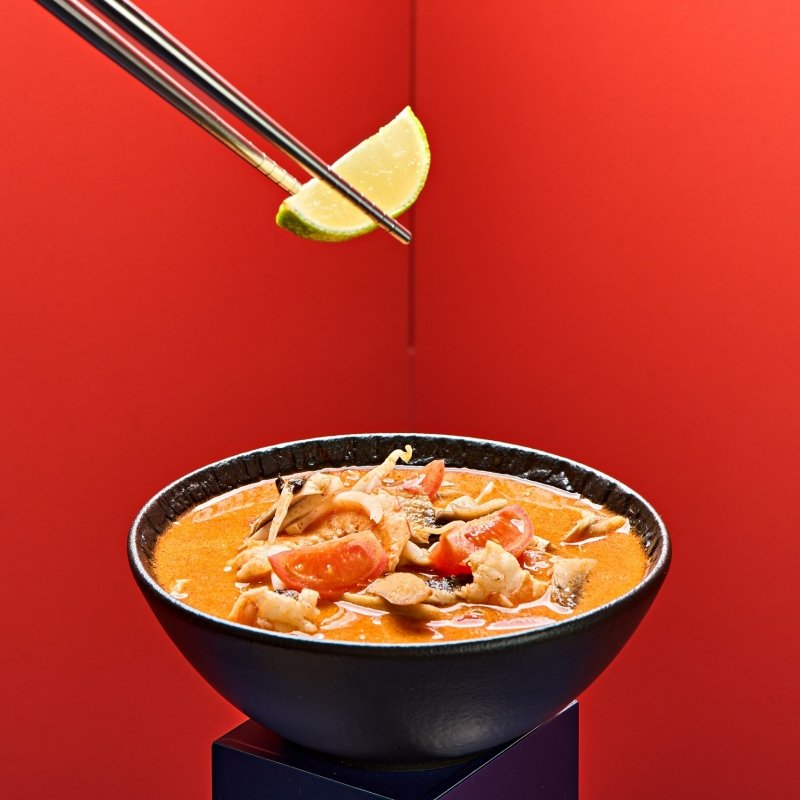Обновленная рецептура! По настоящему острый азиатский суп на кокосовом молоке с креветками, кальмаром, грибами шиитаке и помидорами черри. Бульон на основе смеси пасты том ям, тайского чили, имбиря , лемонграсса, каффир-лайма и кинзы. Подается с долькой лайма и рисом украшенным чёрно-белым кунжутом.