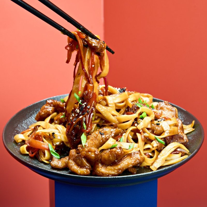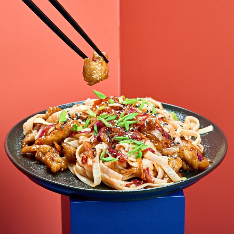 Болгарский перец, морковь, грибы шиитаке, лук репчатый, капуста красная, филе цыпленка, соус сладкий чили, соус соевый, корень имбиря, черно-белый кунжут, зеленый лук. Подается на выбор: с лапшой Удон / рисом.