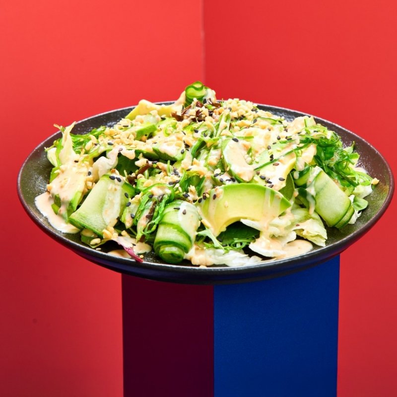 Салат Айсбер, лист салата, авокадо, огурец, водоросли чука, ореховый соус. Украшен лепестками арахиса и кунжутом.
