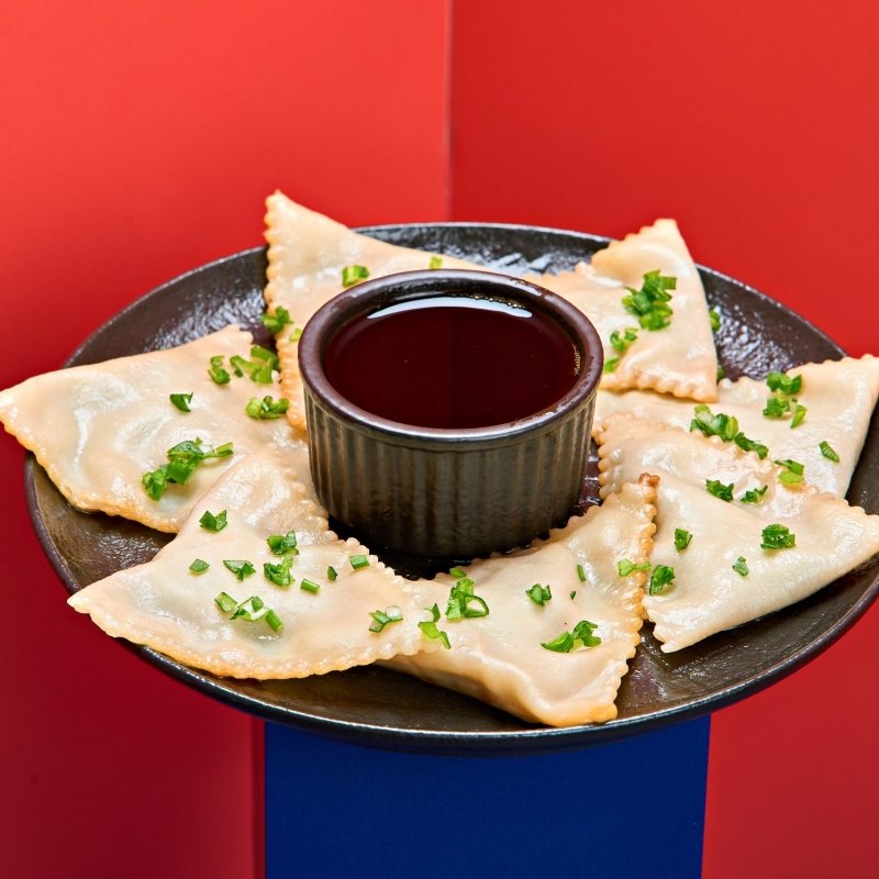 Авторские пельмени от Шеф-повара с лососем и брокколи, посыпаются мелко рубленными колечками зелёного лука, подаются с пряным соусом Якинику.