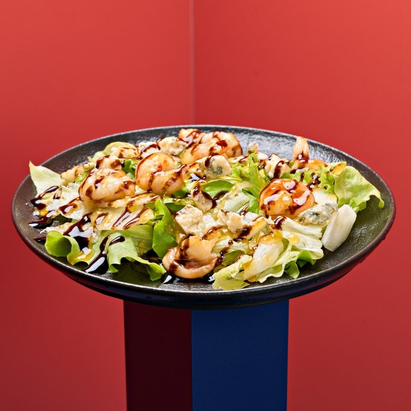 Салат Айсбер, лист салата, груша, сыр Дорблю, креветки, соус сладкий чили, соус ананасовый, бальзамический крем, заправка для салата (масло оливковое, соевый соус, лимонный сок)